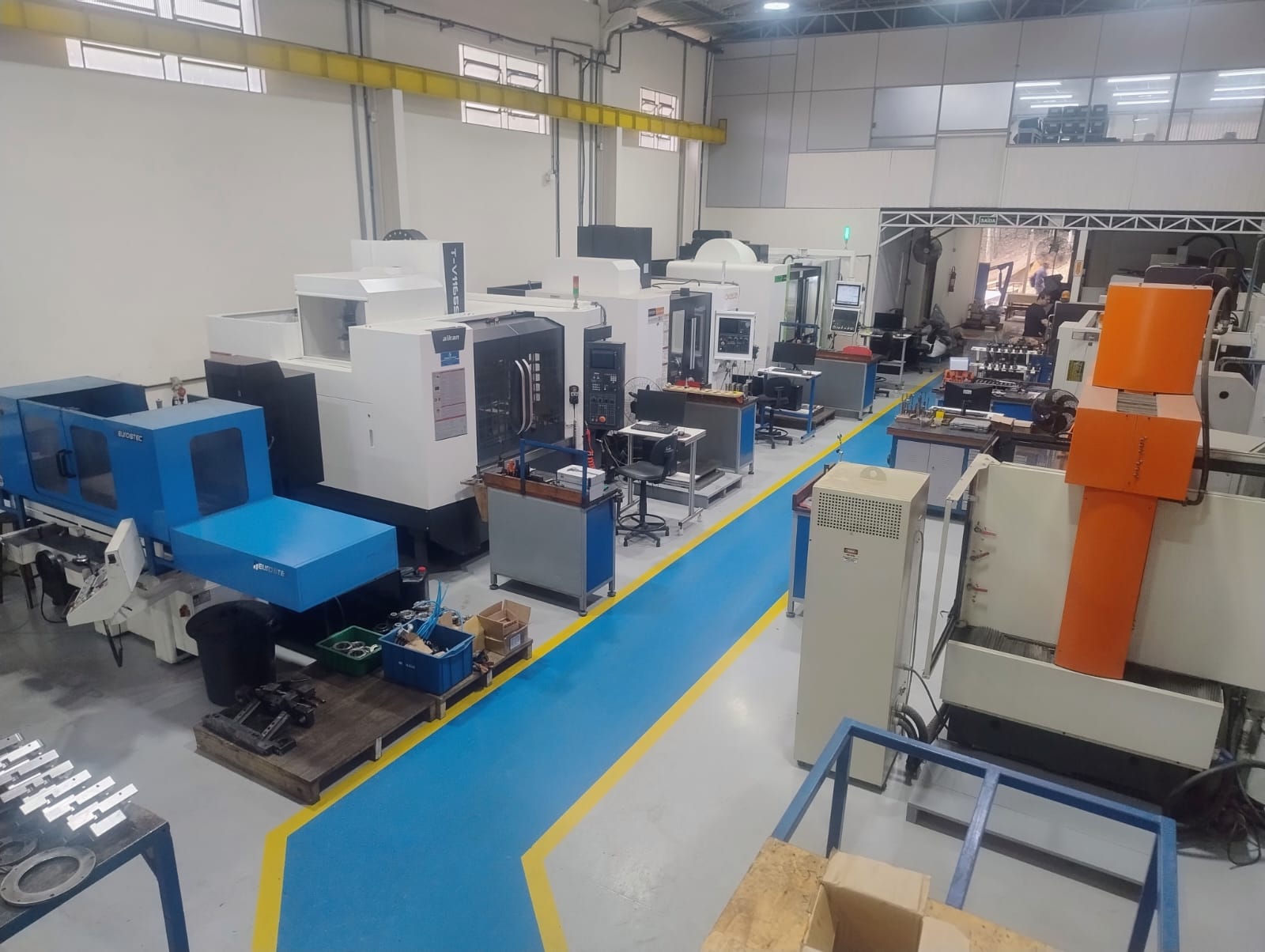 A empresa dispõe de múltiplos centros de usinagem CNC das marcas Hartford, Feeler, Okada, Taikan e Romi, equipados com comandos Mitsubishi e Fanuc, garantindo alto desempenho, repetibilidade e controle preciso dos processos.